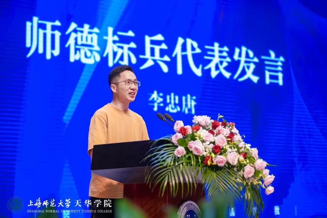 实习实训处教师李忠唐作为师德标兵代表发言,他回顾了自己在天华求学从教的人生经历,并表达了对学校与国家的感激之情。结合工作经历和切身体会,他向大家分享了自己对教师职业的三点认识和感想:一要树立崇高的职业理想,内化立德树人、教书育人的荣誉感和责任感;二要与时俱进地加强学习,不断拓宽认知视野,更新知识结构,努力成为业务精湛、学生佩服的高素质教师;三要增强改革创新意识,踊跃投身教育创新实践,不断更新教育观念,积极探索教育教学规律,争做一个学习型、创新型教育工作者。展望未来,李忠唐表示将牢记使命,锐意进取,努力谱写天华教育发展新篇章,争做一名无愧于人民、无愧于时代的好老师!