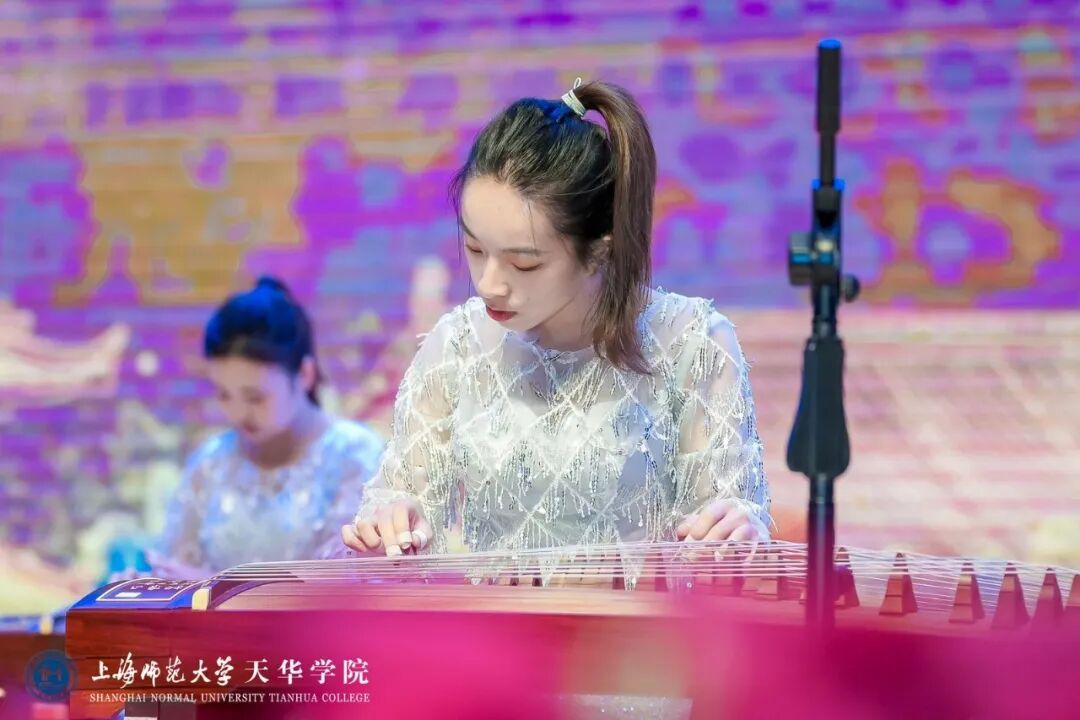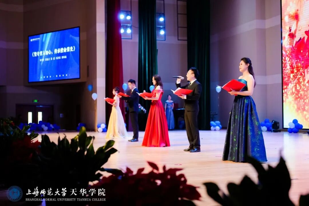 大会在天华交响管乐团《歌唱祖国》和《勇往直前》中拉开序幕,两首充满激情与力量的交响乐曲让大家感受到天华学子们对祖国的热爱以及奋力前行的决心。何昆仑、冯恬恬、陈慧美、李艳艳的情景剧《与名师的时空对话》以唯妙唯俏的精彩演绎,让我们仿佛置身于那个时代,感受到许渊冲老先生与韩素音女士身上所蕴含的家国情怀、严谨的治学精神与深厚的人文素养。学前教育学院学生带来舞蹈《小乐曲·汉唐》,娓娓道来的歌曲,窈窕温柔的舞姿,再现了汉唐乐舞的清雅和优美。曹烜毓、朱奕非、邱晟吉、郭超、冯泽茜的诗朗诵《坚守育人初心,传承使命荣光》,歌颂了辅导员老师们工作的艰辛与不易,同时也表达了老师们为党育人、为国育才的决心。云韶筝团带来的古筝《蹀马倾杯舞千秋》压轴登场,将我国古代宫廷音乐的韵味旨趣演绎得入木三分。