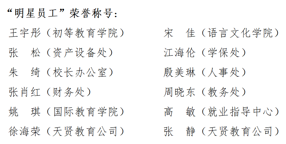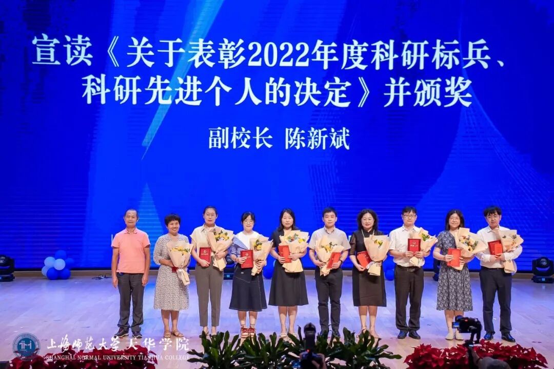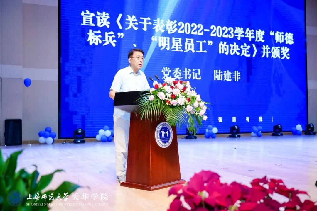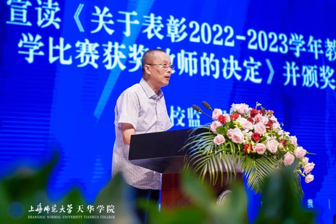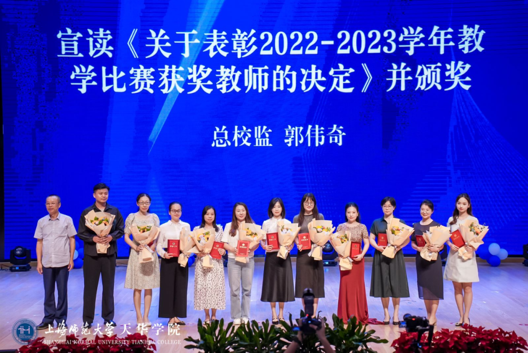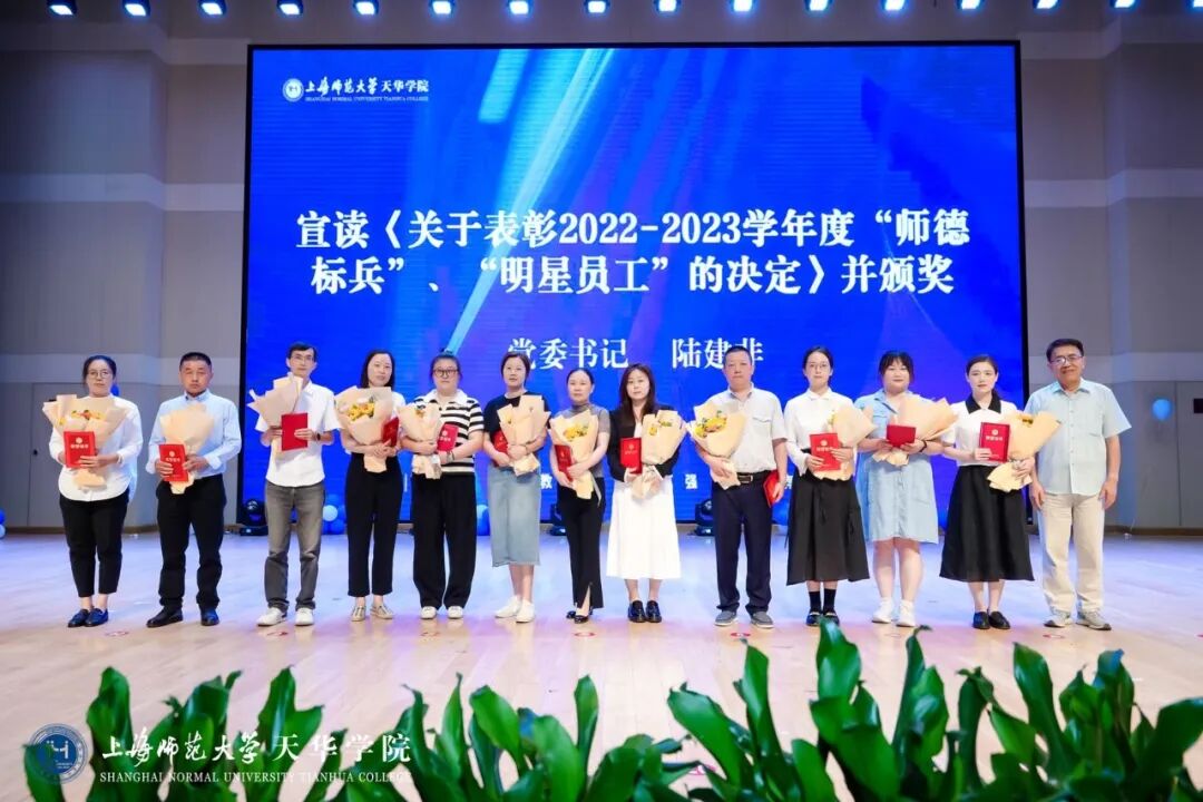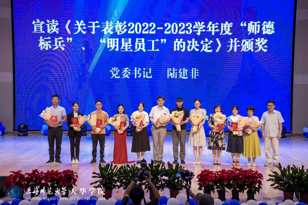 会上,党委书记陆建非宣读师德标兵、明星员工表彰决定,副校长陈新斌宣读2022年度科研标兵、科研先进个人表彰决定,总校监郭伟奇宣读2022-2023学年教学比赛获奖表彰名单,党委副书记许岳宣读2022-2023学年本科生学科竞赛优秀指导教师表彰决定。获奖教师依次上台接受表彰并合影留念。