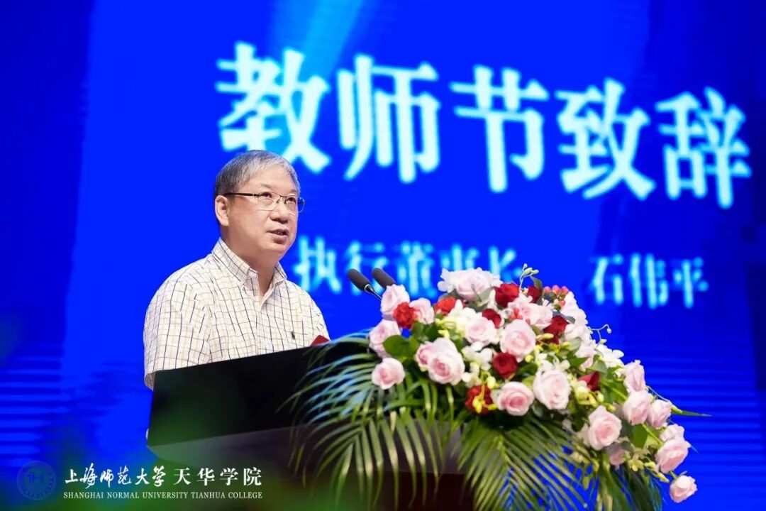 执行董事长石伟平在致辞中首先向努力耕耘、辛勤工作在第一线的广大教师致以节日的祝贺;向为学校的生存发展呕心沥血、恪尽职责的管理和服务人员表示最衷心的感谢;向为学校的改革、建设和发展做出重要贡献的老教师、老领导表示最崇高的敬意!石伟平指出,十八年来,学校办学条件明显改善、在校生规模不断扩大、教科研水平稳步提升、人才培养质量显著提高。事业发展永无止境,高质量建设应用型民办院校,需要全体老师团结一心、共同奋斗。他对全体教师提出三点希望和要求:要继续以立德立行为本,弘扬高尚师德,满怀仁爱之心;要继续以治学精业为要,精心执教,潜心科研;要继续以荣校兴校为任,团结一心,积极投身于学校转型发展事业。石伟平表示,作为天华历史发展的参与者、创作者,要秉持“专、通、雅”协调发展的育人理念,继续发扬艰苦奋斗、踏实肯干的优良传统,群策群力,久久为功,为学校的长足发展贡献智慧和力量。