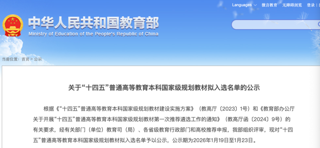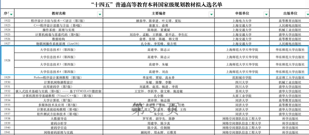 2026年1月19日,教育部公示《“十四五”普通高等教育本科国家级规划教材拟入选名单》,我校党委书记高建华教授担任总主编、上海师范大学天华学院作为申报单位的《大学信息技术(1-4)》(第四版)教材成功入选,标志着学校在教材建设方面实现新的突破!这也是我校首次入选高等教育本科国家级规划教材!