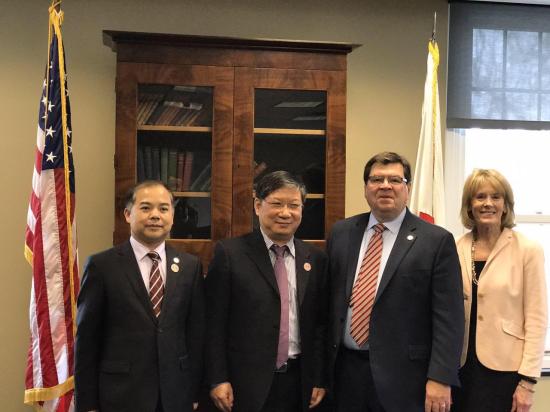 2017年4月27日,我校执行董事长石伟平、校长叶才福以及国际交流处处长胡珍应邀回访了美国伊利诺伊州立大学。对方校长Dr. Larry Dietz, 教务长Dr. Jan Murphy等重要校级领导参加了签约仪式。在前期合作洽谈的基础上,双方签署了视觉传达专业的国际合作办学协议。根据协议内容,联合培养项目将于2017年9月开始招生,其中三分之一的课程将由外方教师来沪授课。第四年学生可赴美国伊利诺伊州立大学学习,条件合格的学生将获得两校学位证书。