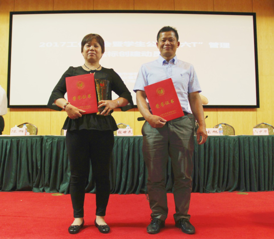 (学生公寓管理部张建芳同志与物业维修部沈利明同志上台领奖)