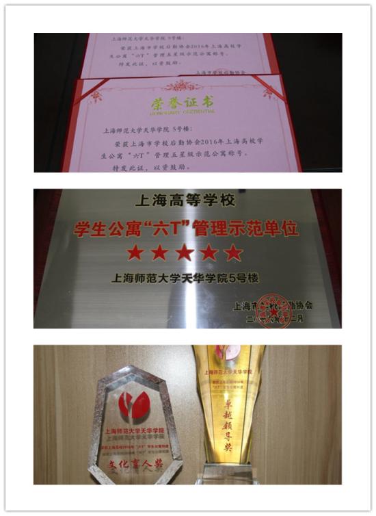 自2015年我校五幢公寓被上海市学校后勤协会评为 “6T”管理四星级达标公寓荣誉称号以来,我校学生公寓以“6T”管理实务为标准,深入推进上海高校学生公寓实务规范管理,不断创新方法,努力提高服务水平。2016年,我校申报的5、9号学生公寓,经上海市高校学生公寓“六T”专家评估组实地检查,被评为“上海高等学校学生公寓六T实务现场管理达标公寓示范楼” ,同时,学校荣获2016年度上海高校“六T”管理2个专项奖:“卓越领导奖”与“文化育人奖”。学生公寓管理部张建芳同志与物业维修部沈利明同志,以其突出的表现分别入选首届生乐杯上海高校“感动公寓、感动物业”十佳先进人选与“感动物业”先进人选;我校2014级胡芳琪同学荣获上海市感动公寓征文比赛三等奖。