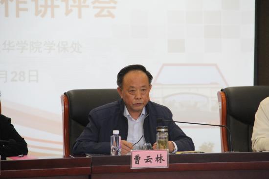 曹书记首先就学期以来开展的中英文辩论训练、早晚自习视频播放、经典阅读三项特色学生管理工作,德育学分制度运行、校园文化活动建设、安全管理、辅导员队伍建设四项学生管理常规工作进行了讲评;同时,对下一阶段的毕业生工作、心理健康教育、中英文辩论训练、辅导员学年考核、学生集中军训、征兵动员、校园安全稳定等七项工作进行了详细的部署。