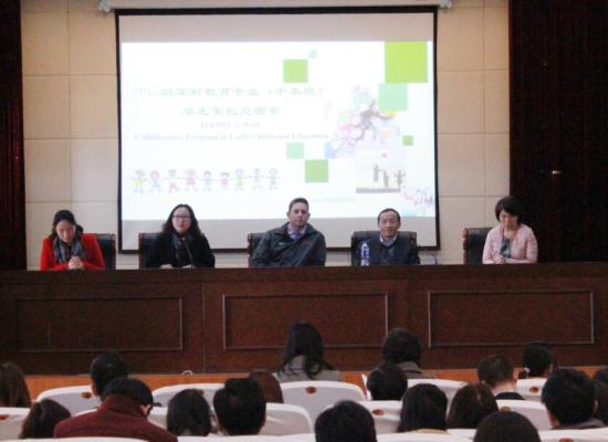 上海师范大学天华学院教育学院于3月16日10:45召开了2015级中美合作学前教育专业学生家长见面会。本次活动旨在对今年8月份即将前往美国西俄勒冈大学学习的同学及各位同学的家长进行答疑,莅临本次见面会的有西俄勒冈大学副校长杨能强、西俄勒冈大学教育学院院长Dr.Mark Girod、我校副校长龚春蕾、教育学院副院长徐娟、国际交流处处长胡珍、校党委书记助理凌琦、中美学前教育专业主任张丽、教育学院分团委书记及中美学前专业辅导员朱可。