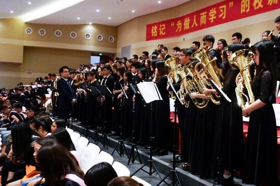 毕业典礼大会在校交响管乐团现场演奏的雄壮国歌声中拉开帷幕。校长叶才福致辞,他对圆满完成学业、即将告别母校踏上新征途的毕业生表示祝贺与期许,对参加毕业典礼的各位领导、老师和家长的到来表示感谢。叶校长强调,我校通过十余年的潜心办学,取得的成绩有目共睹,2017届秋季1709名毕业生在各项考试中成绩斐然,毕业生的计算机一级考试通过率达到96%,全国大学英语四级考试通过率达到78%。四年期间,有150余名同学获得过上海市级及以上的各类荣誉和奖项,有11人先后获得国家奖学金,9人先后获得上海市奖学金,112人获得过上海市教育基金会冯水康奖学金,235人获得国家励志奖学金。叶校长在过去三年中,分别送给毕业生“恒心、专心、爱心”为关键词的寄语,今年他又送给2017届毕业生两个字:“耐心”,希望大家习得“耐心”这一良好品质,学习“工匠精神”,毕业后继续践行 “为做人而学习” 的校训,真正成为“专、通、雅”协调发展的应用型人才;他祝愿2017届秋季毕业生在今后的生活中扬帆远航,鹏程万里!