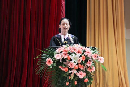 浓浓离别意,深深母校情。来自语言文化学院魏玮作为毕业生代表发言,她也是今年我校34名考上国内外研究生同学的代表。魏玮同学用“坚持”、“奋斗”总结了大学学习和生活,代表全体毕业生表达了对母校的眷恋与感谢、对老师的感激以及对同学情谊的珍惜之情。通识学院聂晓晶老师代表全体教师对同学们的毕业表示了衷心的祝贺,他从其通识教学的大数据统计出发,以“时间”为关键词,追寻大学的梦想,叩问生命意义。聂老师的发言充满深情,博得了一片片掌声。
